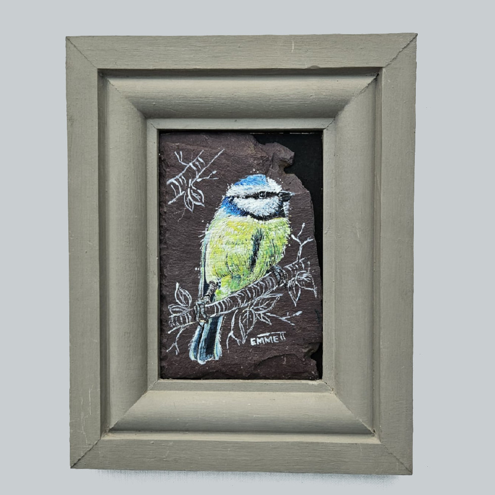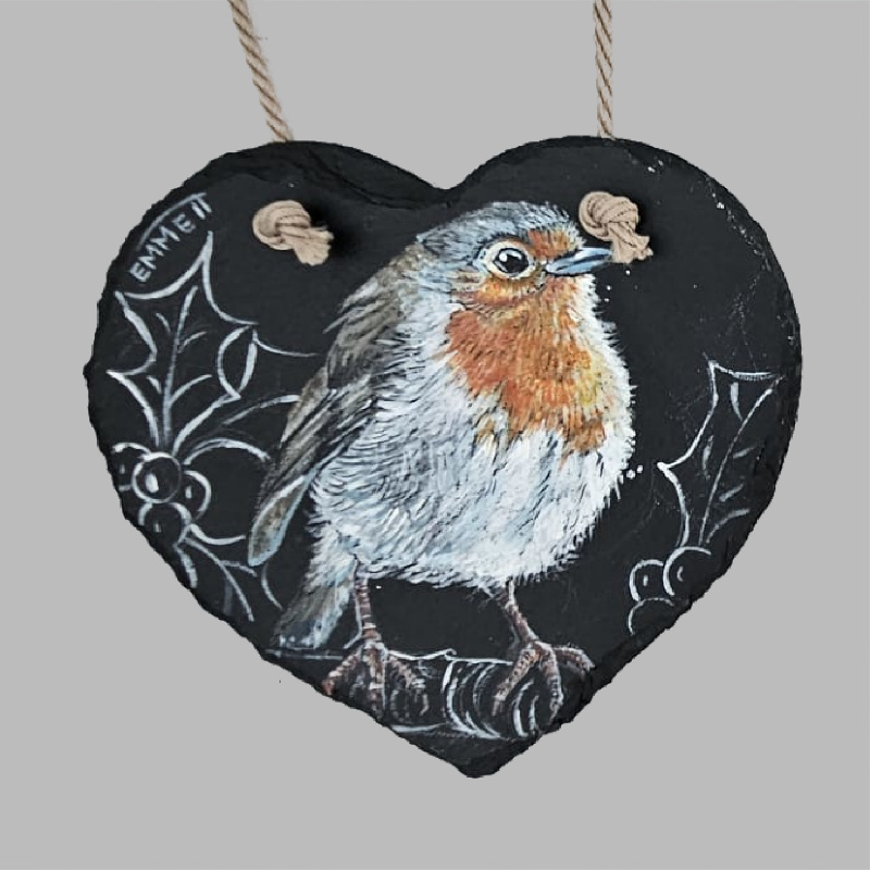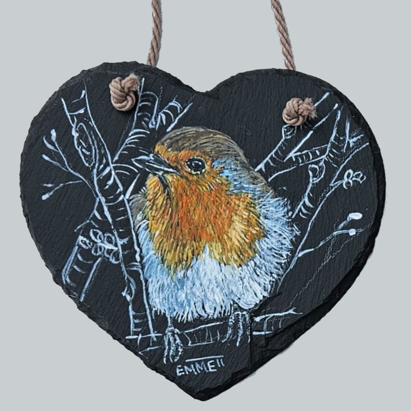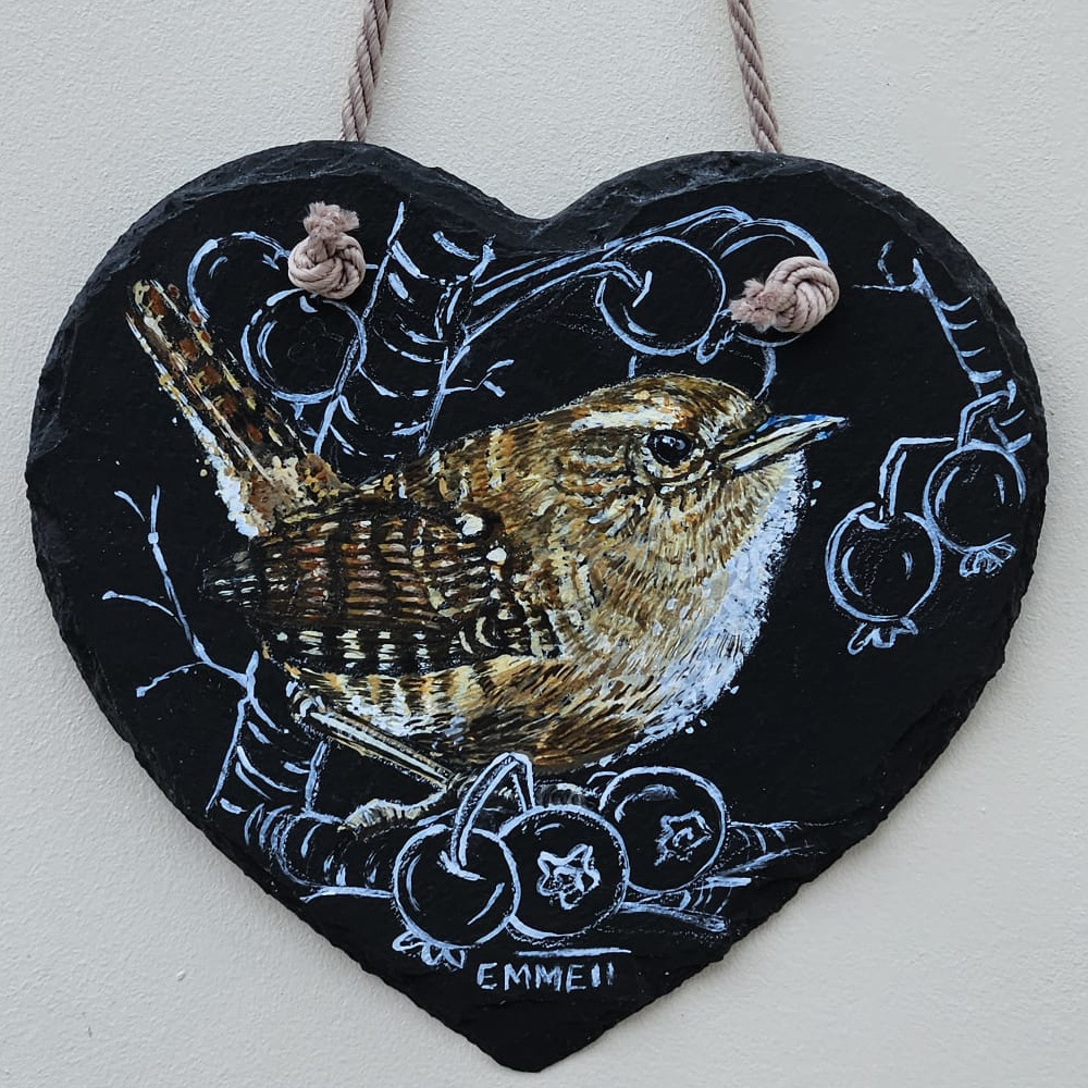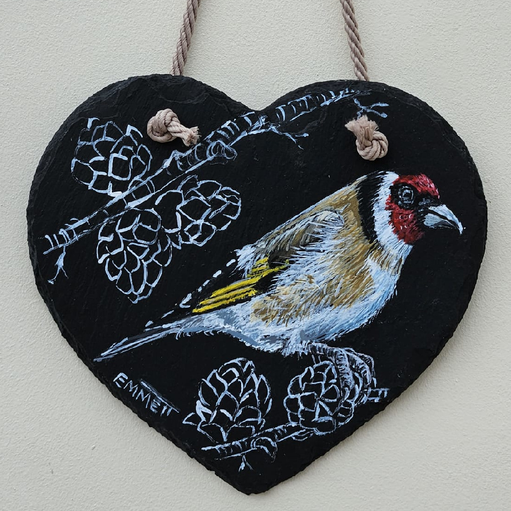 Gallery All Sold Items For Sale Reclaimed Slate A collection of artwork painted on reclaimed slate. Each piece is weathered by the sea giving the artwork a unique shape and feel. Heart Slate Below are some birds painted on cut heart slate